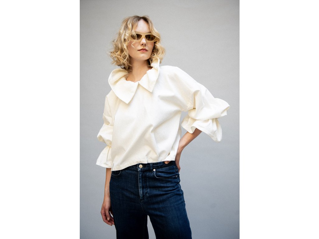 Rafinovaná blůza z tkaného bavlněného žakárového plátna s jemnou strukturou a nenápadným leskem. Volný oversize střih kontrastuje s bohatě řaseným límcem a výraznými balónovými rukávy s volány, které dodávají modelu eleganci. Nadčasový kousek s osobitým detailem.