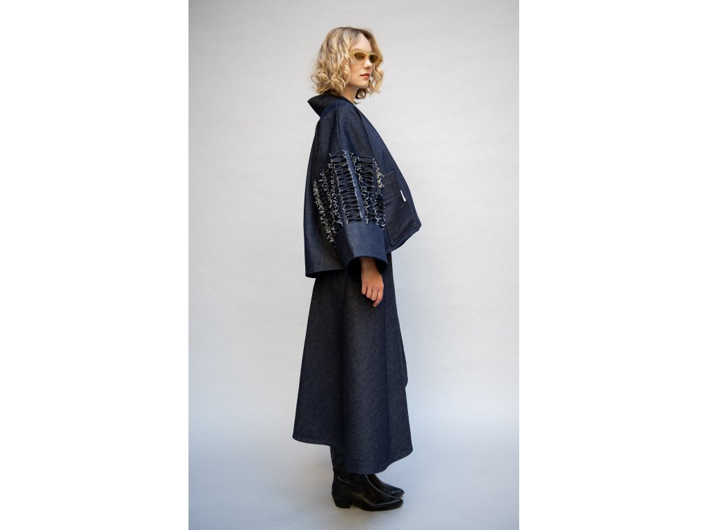 Stylová džínová bunda v kimono střihu z tmavého denimu zaujme širokými rukávy zdobenými textilními detaily ze stejného materiálu. Volnější silueta, hluboký výstřih a praktické kapsy spojují pohodlí s jedinečným vzhledem. Každý kus je ručně zpracovaný originál – ideální pro výrazný městský styl.