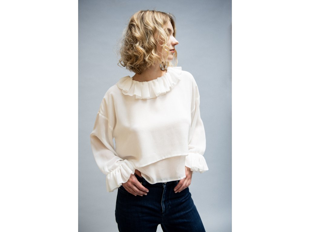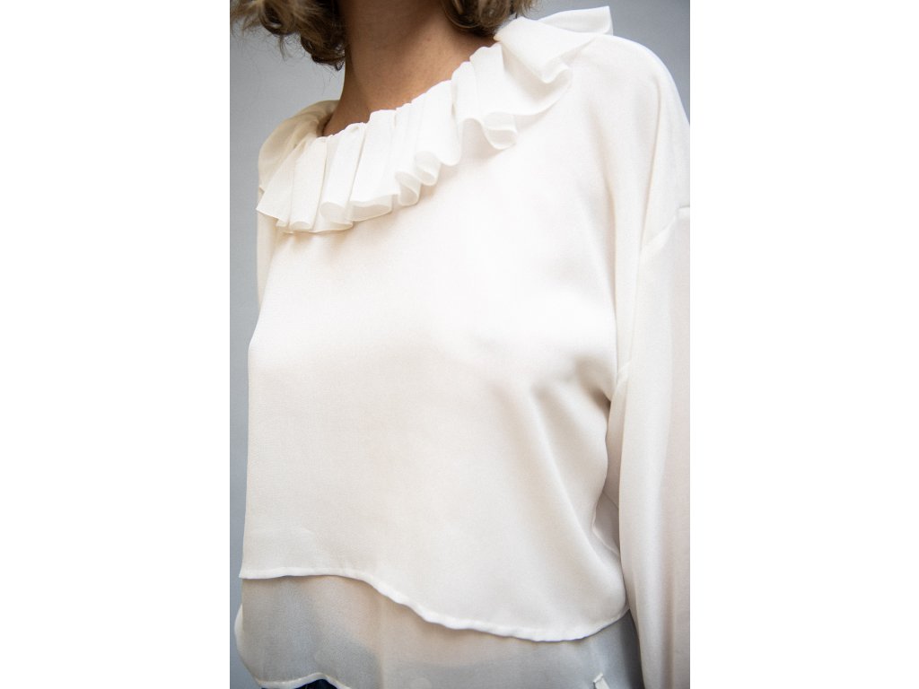 Blůza je ušita z jemného hedvábného krepdešínu ve dvou vrstvách. Má volný oversize střih, který kontrastuje s bohatě řaseným límcem a výraznými balónovými rukávy, zakončené volánem. Halenka se pohodlně obléká a je příjemná na nošení. Ruční zpracování dodává tomuto kousku jedinečný vzhled s osobitým detailem.