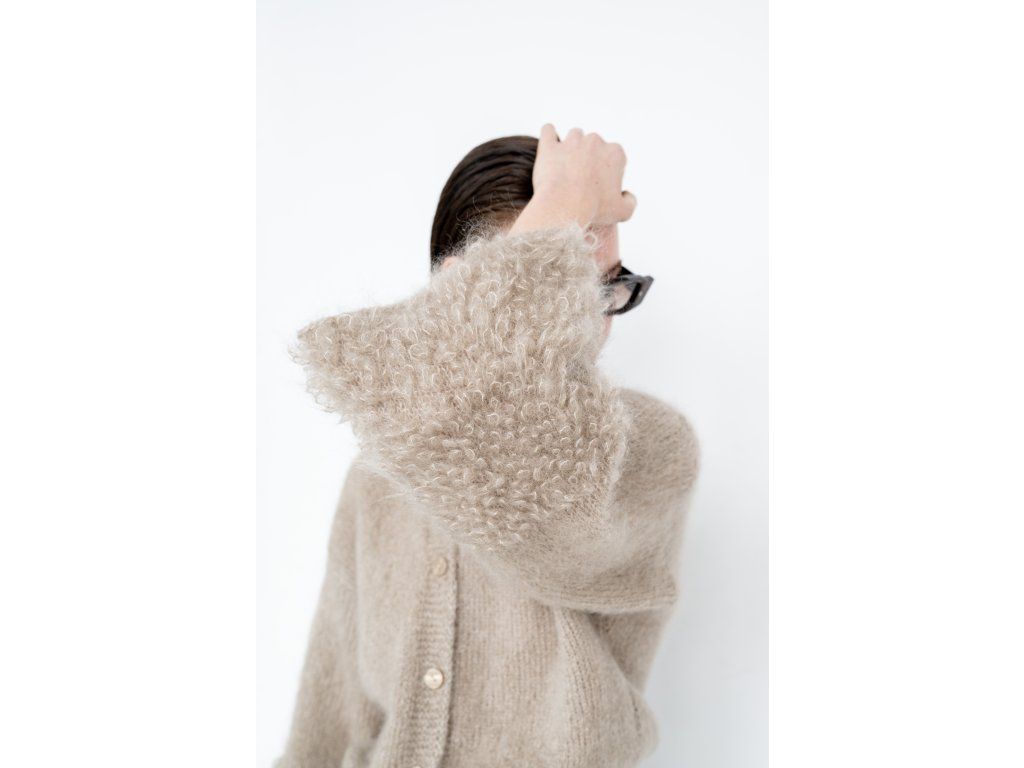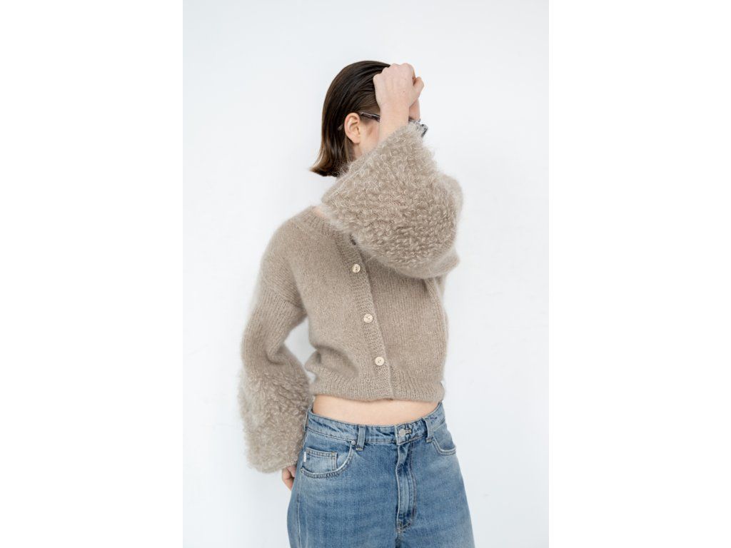 This sweater is hand-knitted from fine yarn and features distinctive textured bouclé sleeves. The cropped cut and flared sleeves give the silhouette a light, modern feel. The sweater is made from a blend of Italian mohair and mulberry silk, making it exceptionally warm yet very lightweight. It fastens with natural mother-of-pearl buttons. This sweater is a one-of-a-kind original! It can also be custom-made in a different color. Please note that this is a handcrafted original, so the delivery time may vary depending on the complexity of the design; it is usually 4 weeks.
