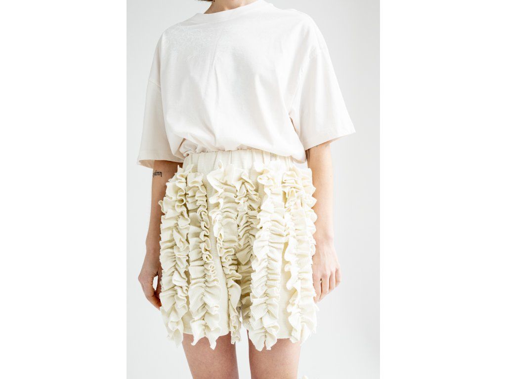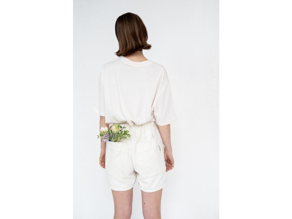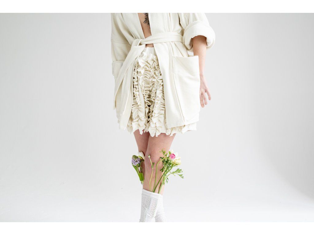 Kraťasy jsou vyrobeny ze směs bavlny a lnu se strukturou jemného proužku. Jsou měkké a pohodlné. Přední díly jsou prošity nabíranými volány. Zadní díly jsou hladké bez zdobení s praktickými kapsami. Všechny vnitřní švy jsou začištěny do bavlněného šikmého proužku.