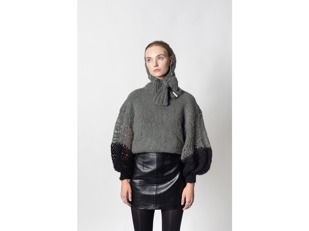 Hand knitted balaclava with tie. The hat is knitted in a scalloped pattern. Ribbed hem frames the face. The balaclava is made of bulky yarn in a blend of very fine, pure natural fibres of merino wool extrafine and alpaca.The advantage of the balaclava is its high warmth, softness and delicacy.