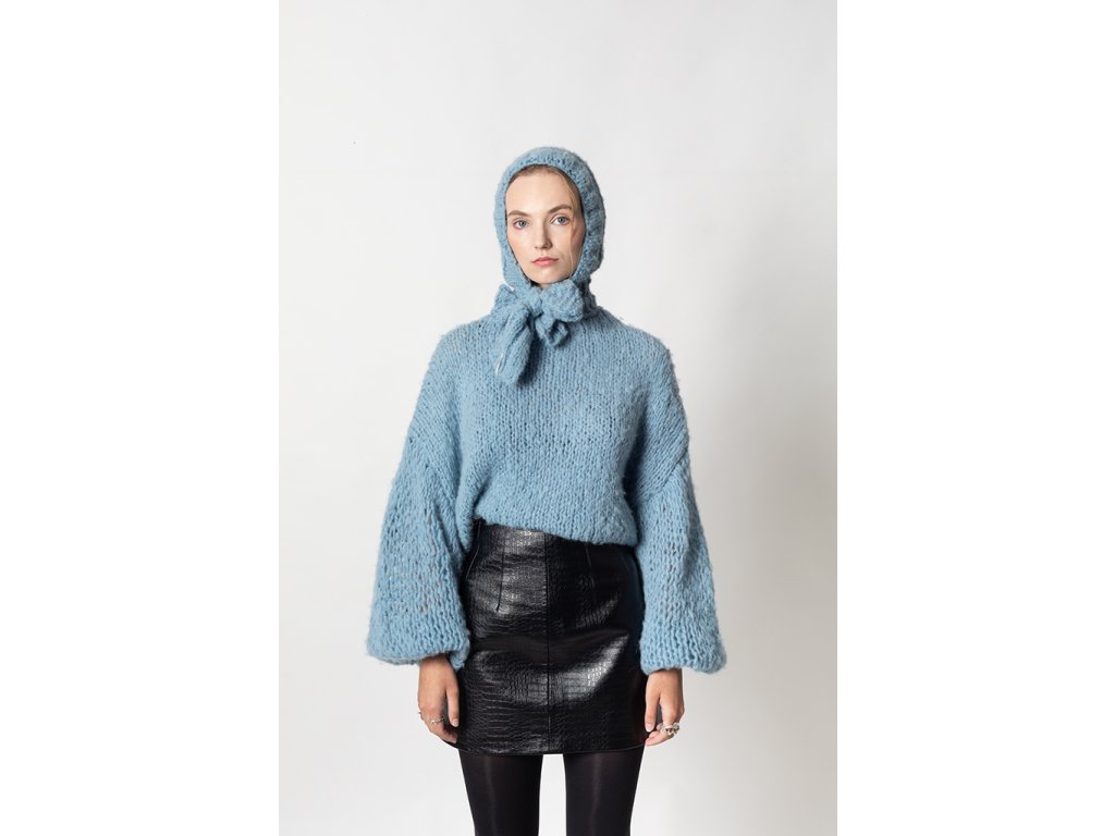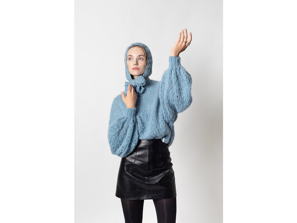 Hand knitted balaclava with tie. The hat is knitted in a scalloped pattern. Ribbed hem frames the face. The balaclava is made of bulky yarn in a blend of very fine, pure natural fibres of merino wool extrafine and alpaca.The advantage of the balaclava is its high warmth, softness and delicacy.