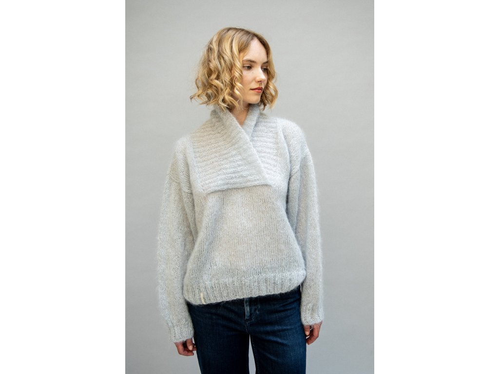Lehký svetr ručně pletený z prémiové směsi mohéru a hedvábí. Díly a rukávy jsou pleteny hladkým vzorem. Rozhalený límec zvýrazňuje kontrastní řádkový vzor. Svetr je pletený v unisize velikosti, snadno se přizpůsobí různým postavám i způsobům nošení. Je vzdušný, ale přesto výhřevný a díky hedvábí je mimořádně příjemný na dotek. Tento kus je určen těm, kdo hledají luxus ve formě, která nepodléhá trendům. Ručně pletený originál vytvořený v České republice.