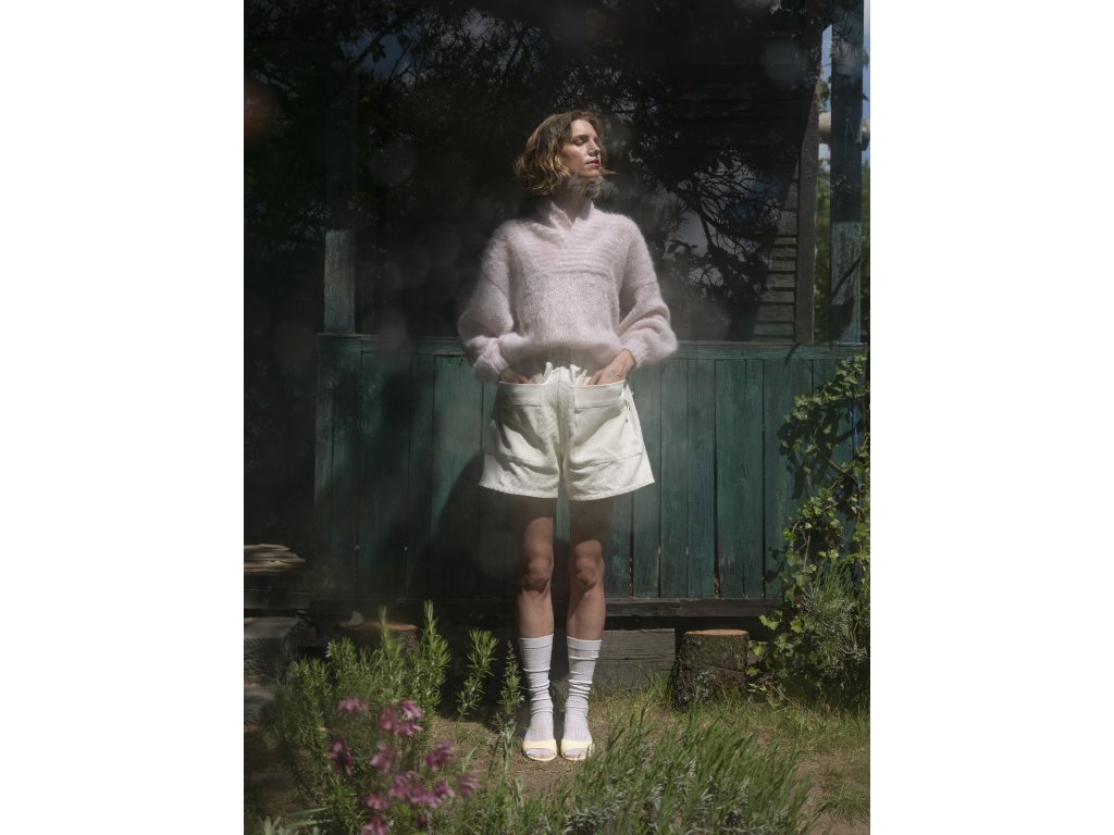 Lightweight sweater hand knitted from a premium blend of mohair and silk. Parts and sleeves are knitted in a plain pattern. The open collar is accentuated by a contrasting row pattern. The sweater is knitted in unisize size, easily adapting to different figures and ways of wearing. It is airy yet warm and the silk makes it extremely comfortable to the touch. This piece is for those who seek luxury in a form that doesn't succumb to trends. A hand-knitted original created in the Czech Republic.