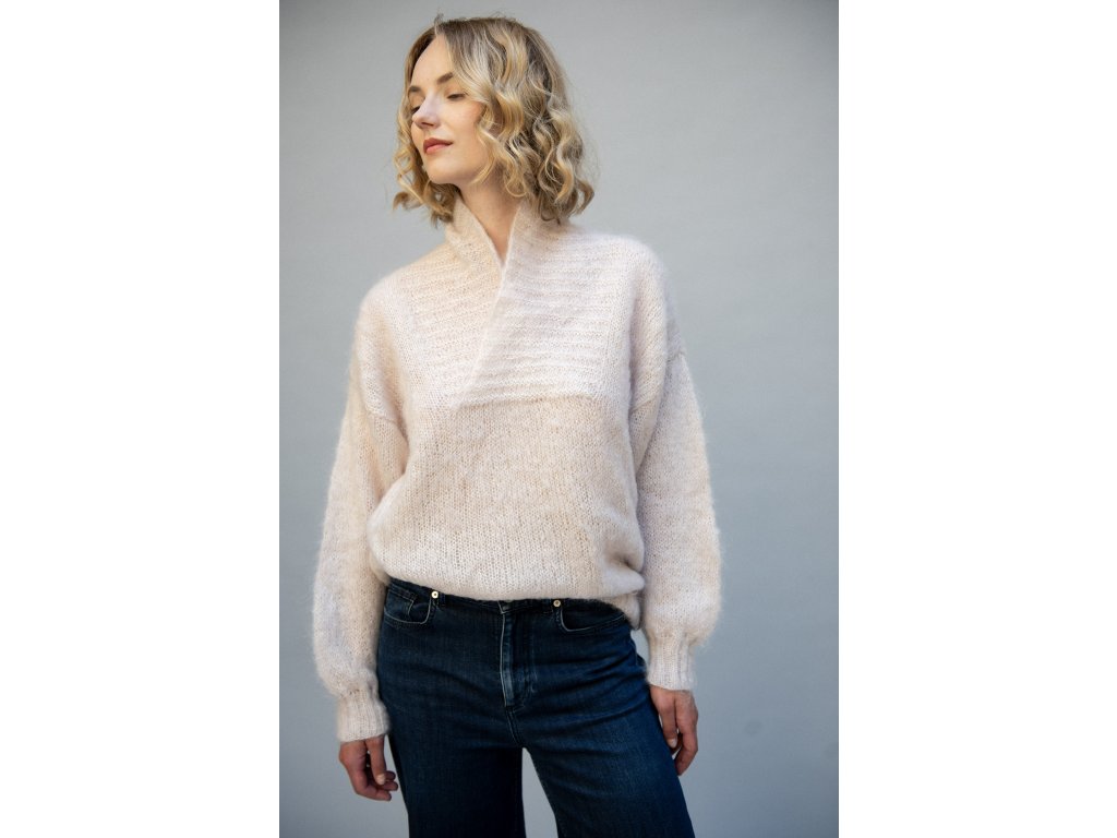 Lehký svetr ručně pletený z prémiové směsi mohéru a hedvábí. Díly a rukávy jsou pleteny hladkým vzorem. Rozhalený límec zvýrazňuje kontrastní řádkový vzor. Svetr je pletený v unisize velikosti, snadno se přizpůsobí různým postavám i způsobům nošení. Je vzdušný, ale přesto výhřevný a díky hedvábí je mimořádně příjemný na dotek. Tento kus je určen těm, kdo hledají luxus ve formě, která nepodléhá trendům. Ručně pletený originál vytvořený v České republice.