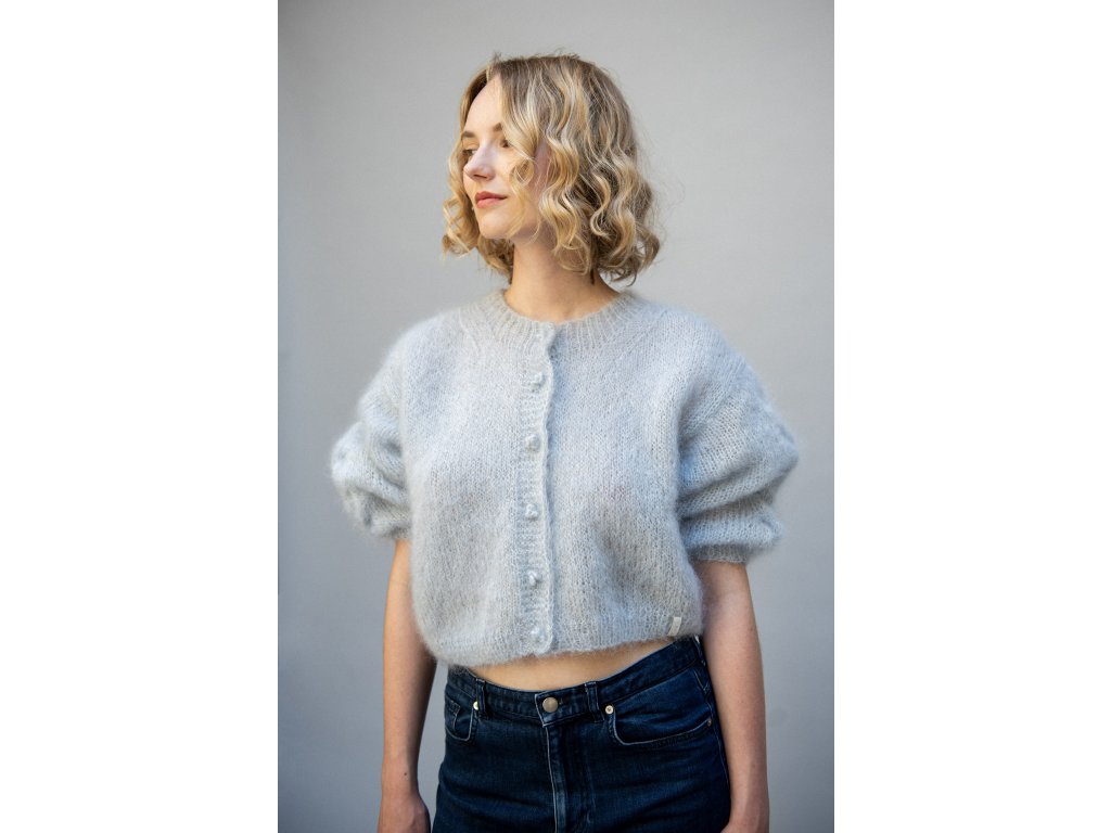 Krátký svetr do pasu se zapínáním je ručně pletený hladkým vzorem s kulatým výstřihem. Je upleten ze směsi italského morušového hedvábí a nadýchaného mohéru. Rukávy jsou pleteny do zkrácené tříčtvrteční délky. Při vyhrnutí lze svetr nosit jako lehké tričko. Rukávy jsou pleteny výrazným copanovým vzorem a jsou staženy do žebrovaného nápletu. Přední díly zdobí ručně šité knoflíky z mohéru a hedvábí. Svetr je upleten pouze v jednom originálním kusu. Tento produkt je možné vyrobit také formou zakázky. Můžete si vybrat barvu dle vašich představ z našeho vzorníku. Mějte na paměti, že se jedná o ručně zpracovaný originál, tudíž dodací lhůta se může lišit podle náročnosti modelu, obvykle bývá 4 týdny.