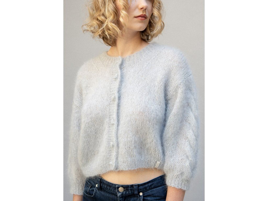 The short waist sweater with a button fastening is hand knitted in a smooth pattern with a round neckline. It is knitted from a blend of Italian mulberry silk and fluffy mohair. The sleeves are knitted in a shortened three-quarter length. When rolled up, the sweater can be worn as a lightweight T-shirt. The sleeves are knitted in a distinctive braid pattern and are pulled into a ribbed patch. The front is decorated with hand-stitched mohair and silk buttons. The sweater is knitted in only one original piece. This product can also be made to order. You can choose the colour of your choice from our swatches. Keep in mind that this is a handmade original, so the delivery time may vary depending on the complexity of the model, usually 4 weeks.