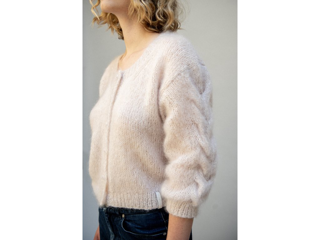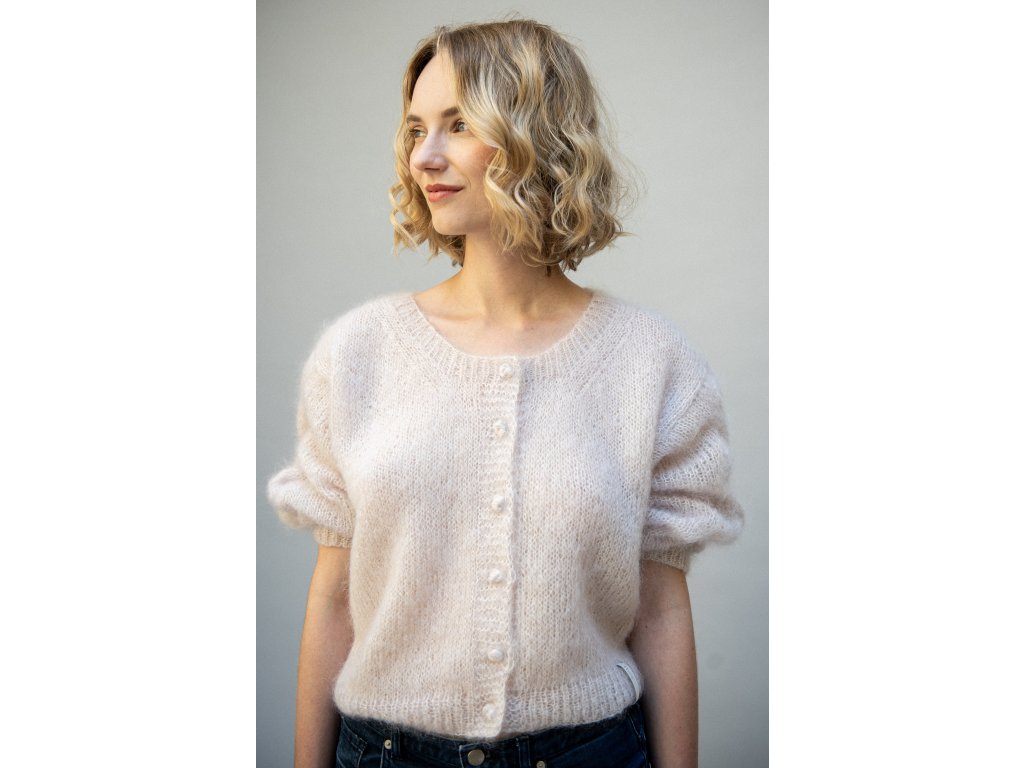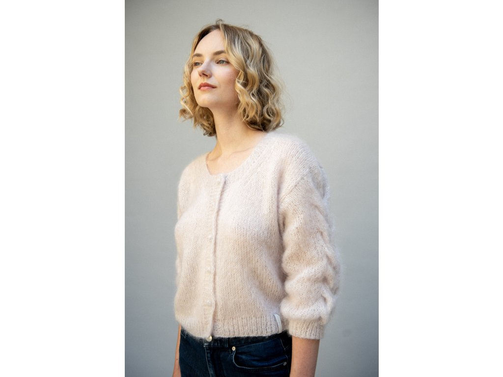 Krátký svetr do pasu se zapínáním je ručně pletený hladkým vzorem s kulatým výstřihem. Je upleten ze směsi italského morušového hedvábí a nadýchaného mohéru. Rukávy jsou pleteny do zkrácené tříčtvrteční délky. Při vyhrnutí lze svetr nosit jako lehké tričko. Rukávy jsou pleteny výrazným copanovým vzorem a jsou staženy do žebrovaného nápletu. Přední díly zdobí ručně šité knoflíky z mohéru a hedvábí. Svetr je upleten pouze v jednom originálním kusu. Tento produkt je možné vyrobit také formou zakázky. Můžete si vybrat barvu dle vašich představ z našeho vzorníku. Mějte na paměti, že se jedná o ručně zpracovaný originál, tudíž dodací lhůta se může lišit podle náročnosti modelu, obvykle bývá 4 týdny.