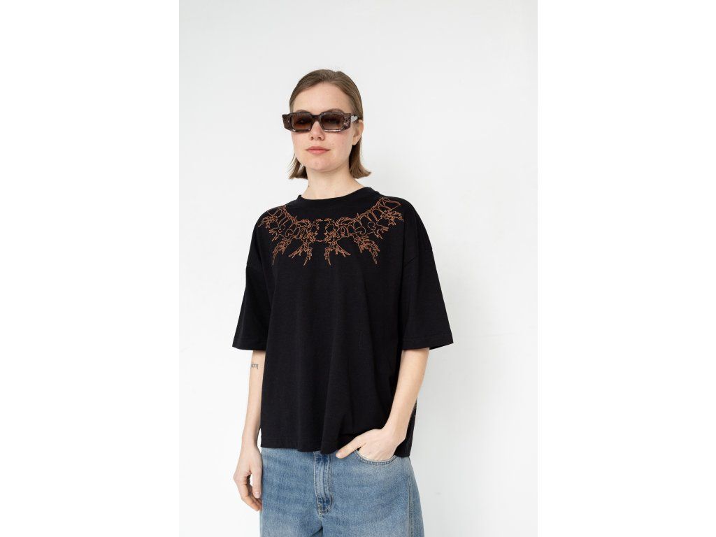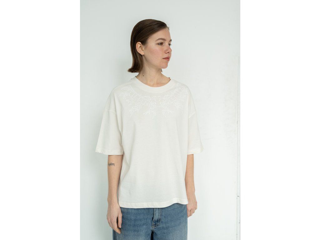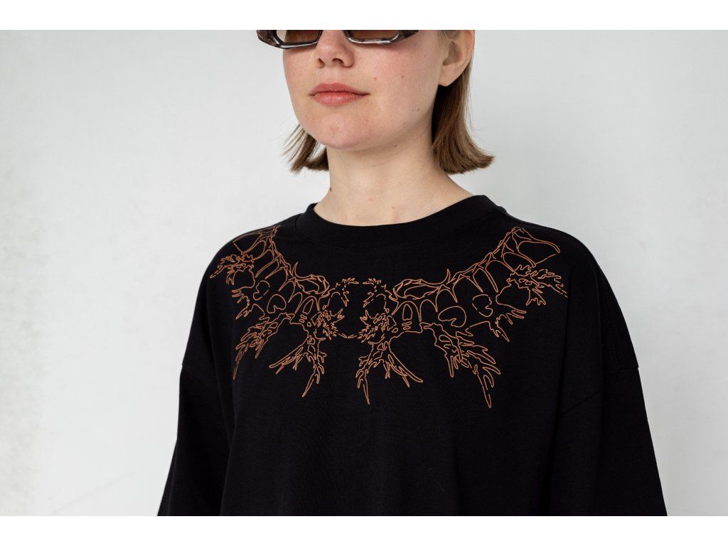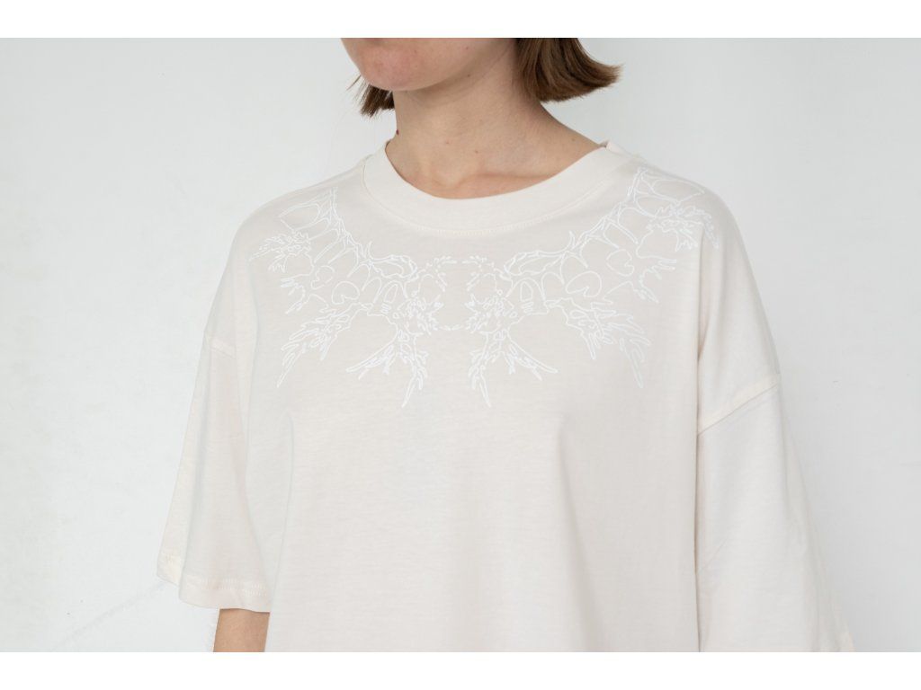 Oversized T-shirt made from certified organic cotton. The neckline features a print of an illustration by artist Barbora Mate. The print resembles a lace collar. The T-shirt is 60 cm long and 54 cm wide. It has longer, wide sleeves that can be rolled up for a stylish look. The T-shirt is comfortable to wear and will become a high-quality, practical addition to your wardrobe.
