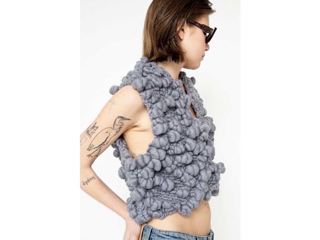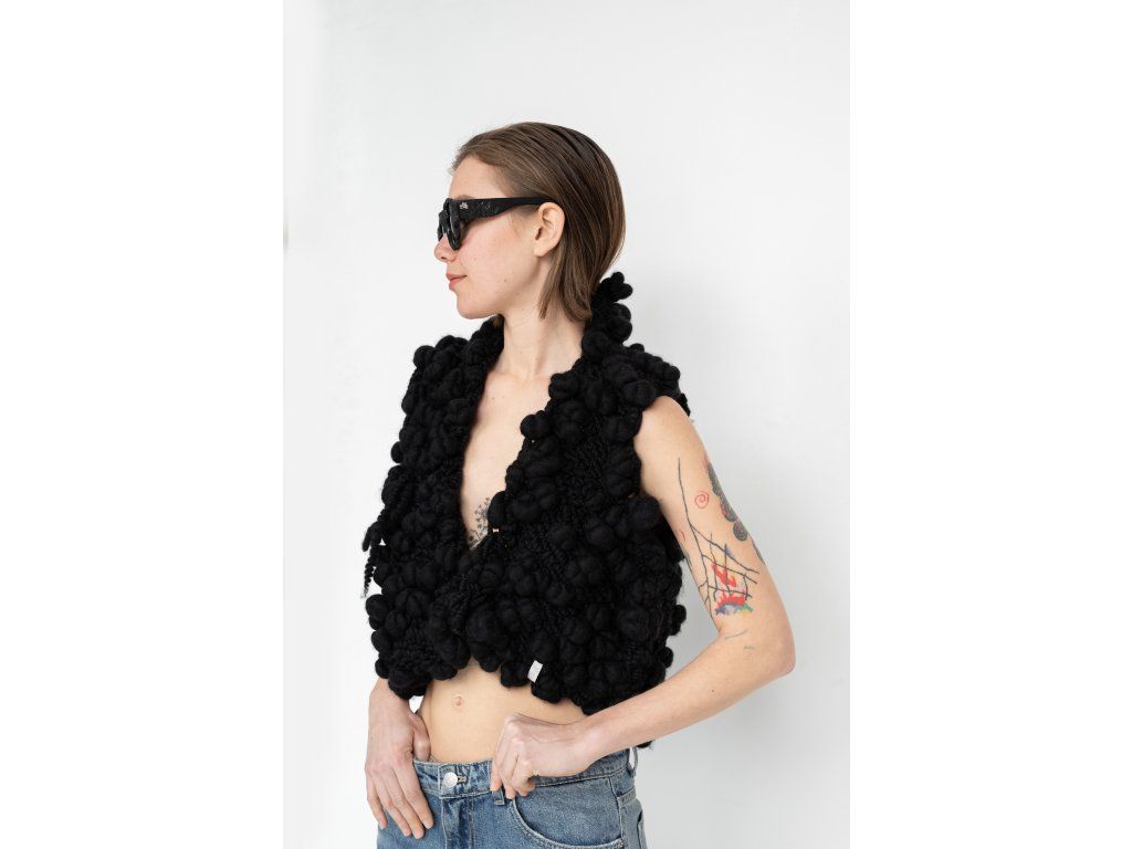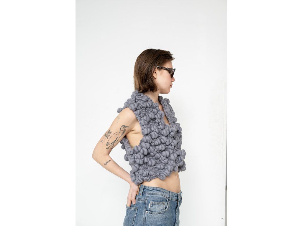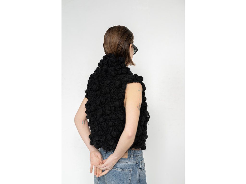 Vesta z ručně předeného merina zaujme svou výraznou plastickou strukturou a organickým vzhledem. Bohatá, objemná příze vytváří jedinečný povrch, který působí syrově i sofistikovaně zároveň. Otevřený střih bez zapínání umožňuje vrstvení a přirozeně kopíruje siluetu těla. Každý kus je originál díky ručnímu zpracování a nepravidelnosti materiálu. Výrazný solitér, který propojuje tradiční řemeslo s experimentálním designem.