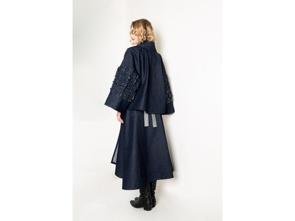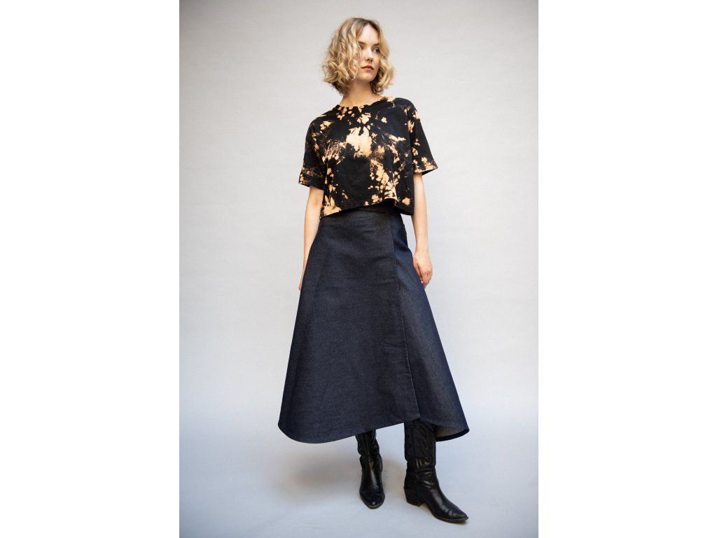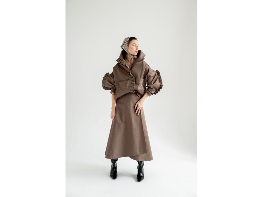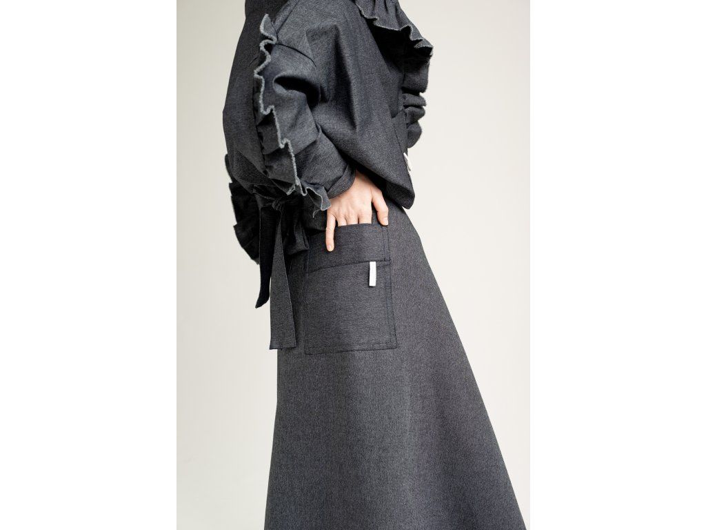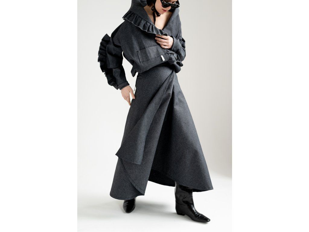 Zavinovací sukně s variabilním zavazováním v pase. Vzadu je doplněna o výrazné našité kapsy, vpředu má rozparek, který se přirozeně otevírá při chůzi. Elegantní A-liniový střih podtrhuje siluetu a umožňuje pohodlné vrstvení – sukně skvěle vynikne i přes kalhoty. Originální design pro výjimečný městský styl.