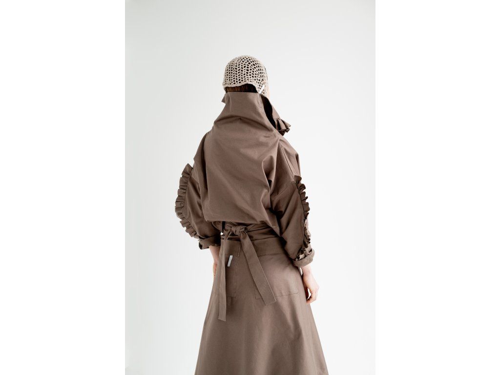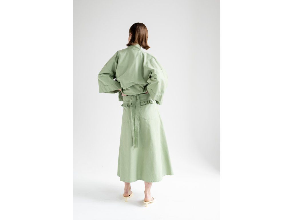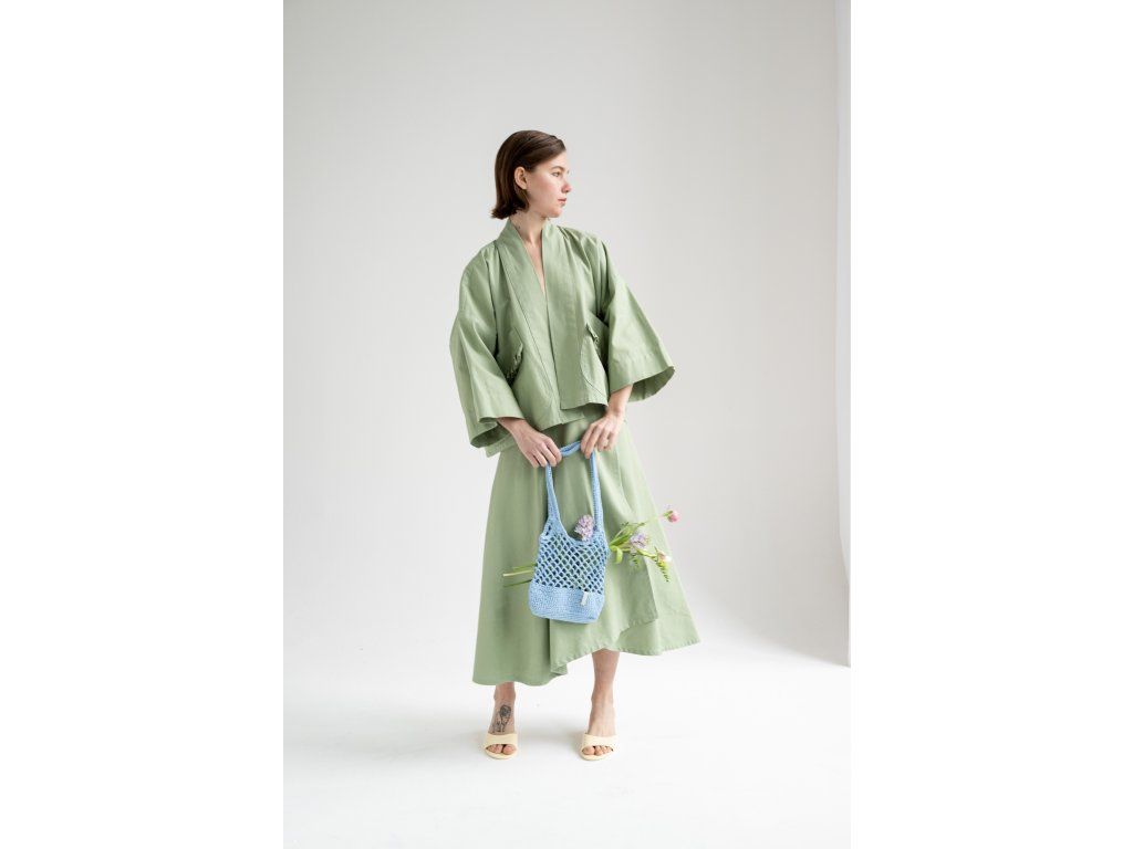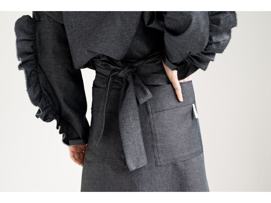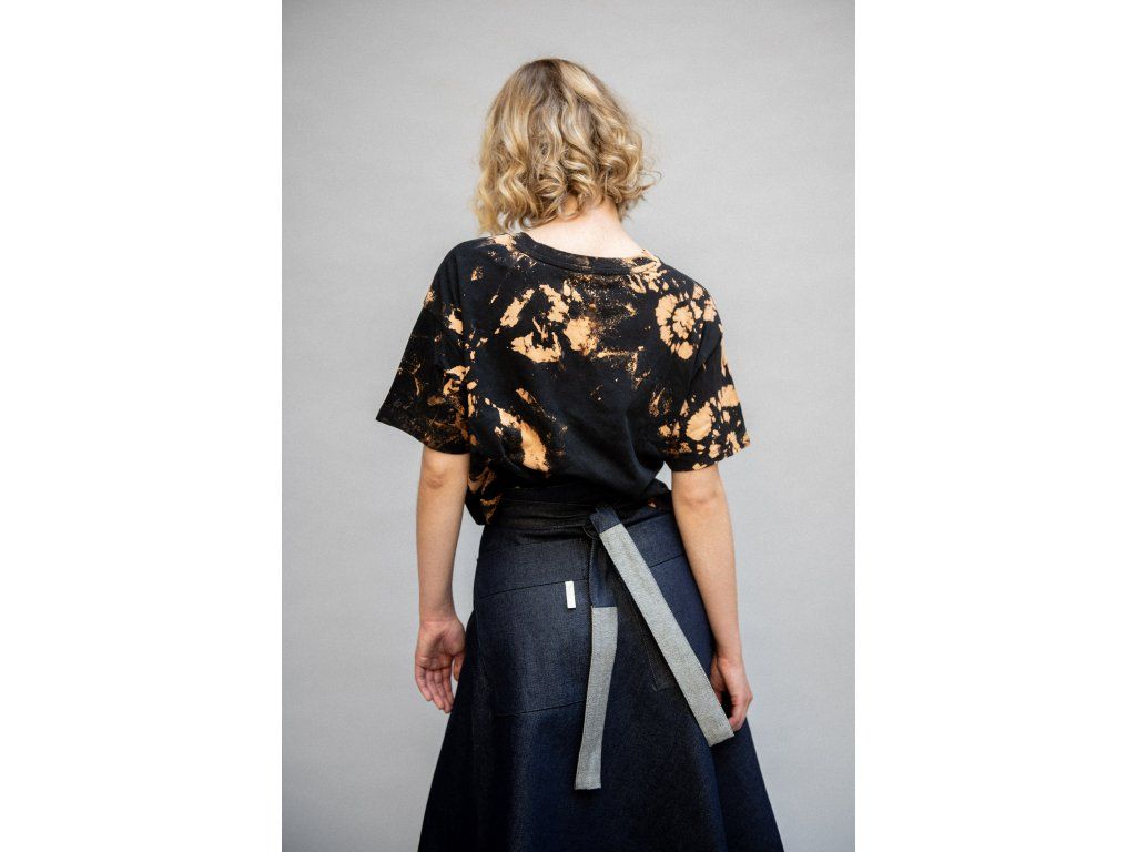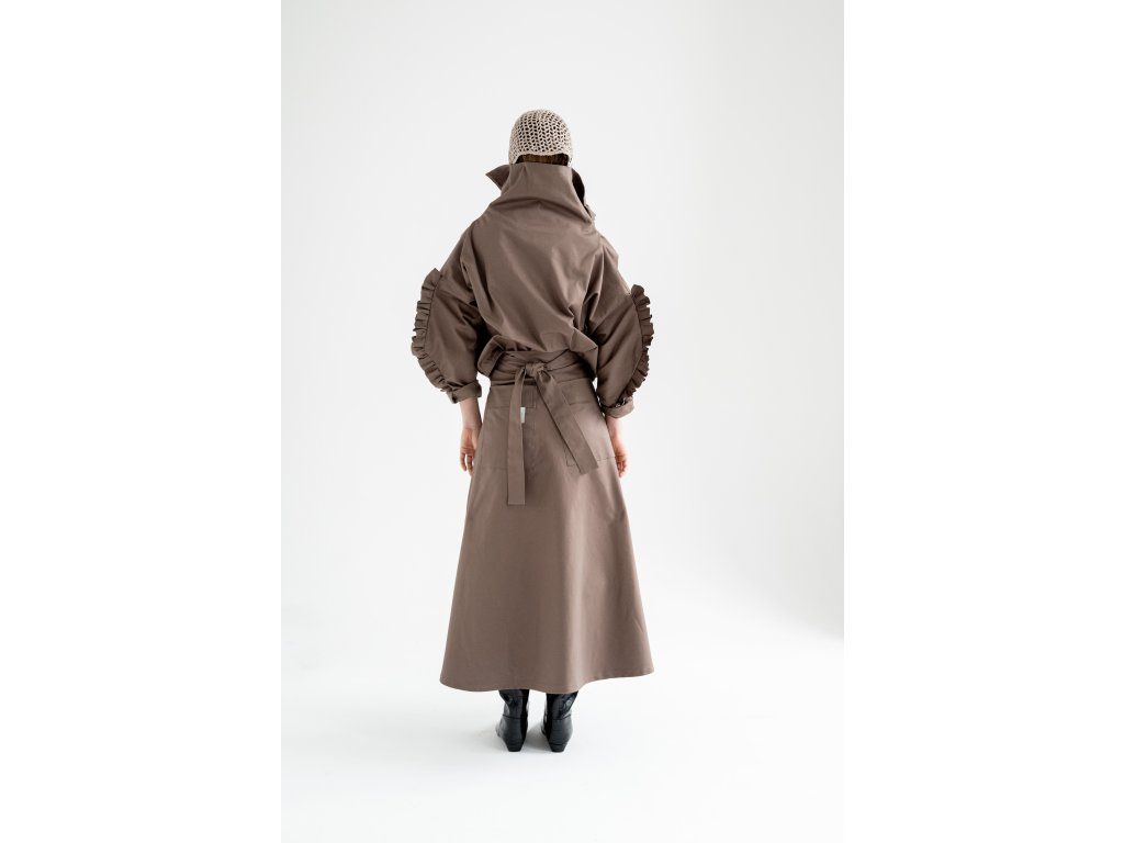 Zavinovací sukně s variabilním zavazováním v pase. Vzadu je doplněna o výrazné našité kapsy, vpředu má rozparek, který se přirozeně otevírá při chůzi. Elegantní A-liniový střih podtrhuje siluetu a umožňuje pohodlné vrstvení – sukně skvěle vynikne i přes kalhoty. Originální design pro výjimečný městský styl.